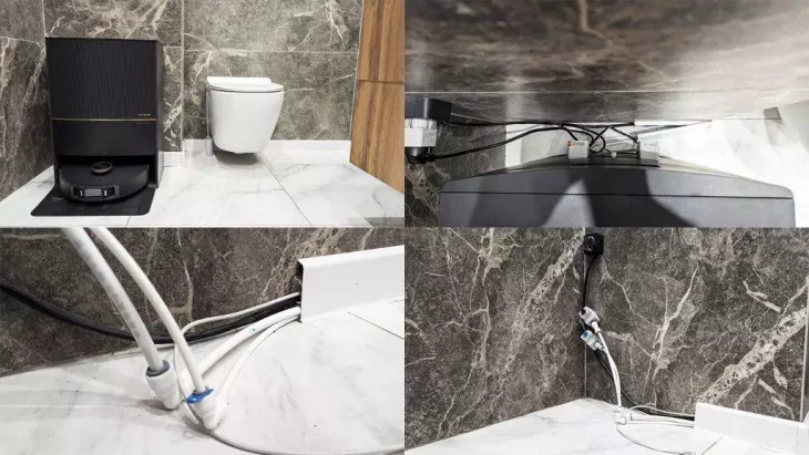 The station is as functional as can be. It self-cleans the dust container, washes cloths with hot water, dries them with warm air after cleaning, and even automatically mixes detergent into the water when washing and refilling the tank of the robot itself. Conveniently, the ramp for the robot to come in and the tray where the wipes are washed are removable. The garbage bag is located in the middle behind the lid.